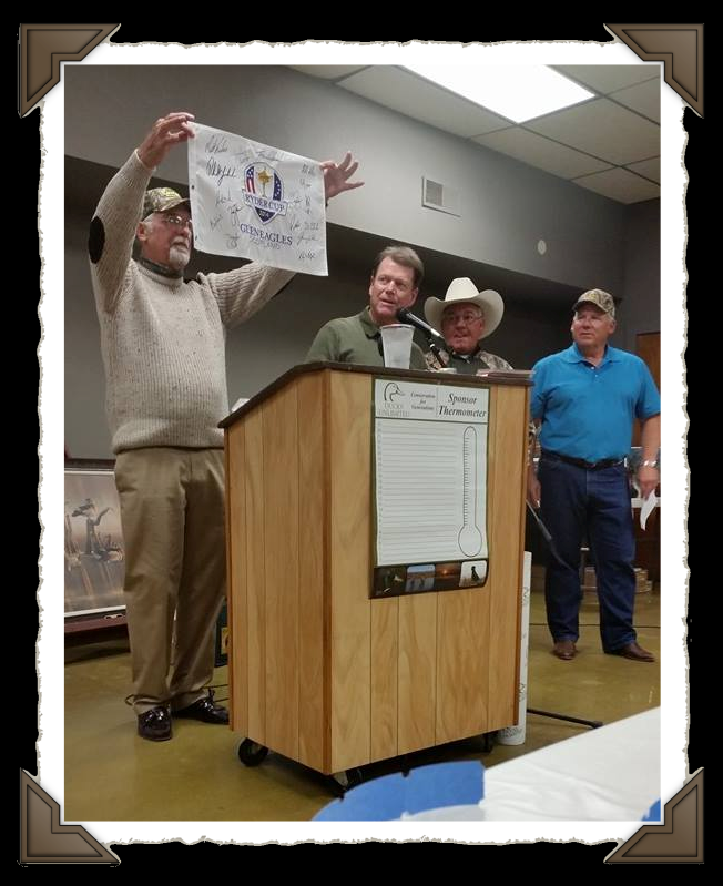 Watson honored Ducks Unlimited with a signed (by all the 2014 team members) Ryder Cup flag. The flag was auctioned be Greg Clement, a generous DU auctioneer, and like Mr. Watson, a Waterfowler's Hall of Fame inductee.